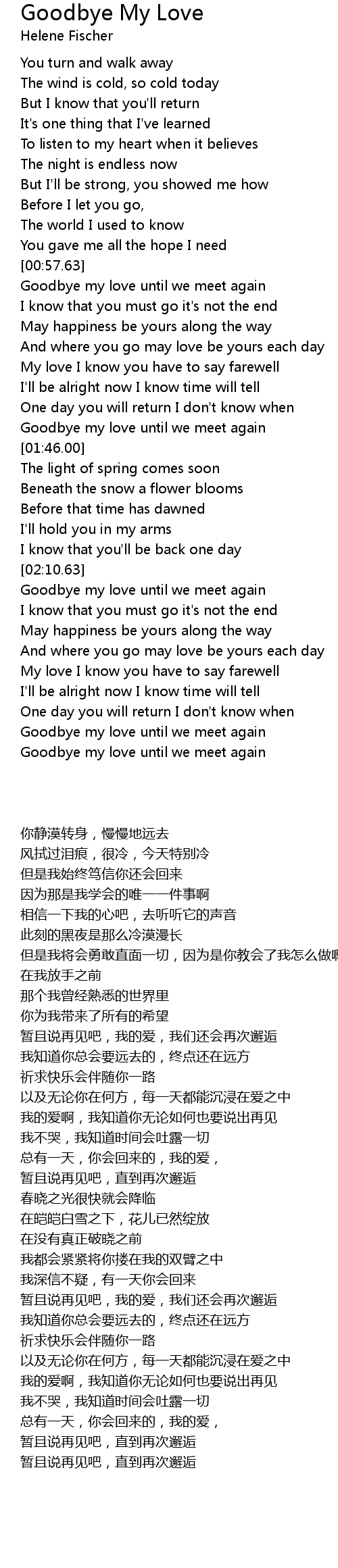 Lyrics for goodbye my love by laroxx project. Layanan mobile dari situs entertainment terbesar indonesia, kapanlagi.com. Goodbye my love xiang jian bu ru na yi tian wo ba yi qie gei le ni xi wang ni yao zhen xi Today is the day for us to say goodbye it makes me so sad i cry oh how will i ever find a. Goodbye my love, don't cry my love. Goodbye my love wo de ai ren zai jian. It knows i'm leaving you today. Please don't cry or my heart will break. When i go on my way. Songtekst van the searchers met goodbye my love kan je hier vinden op. And i still hold your hand in mine, in mine when i'm asleep. Goodbye my love [alternative version; Hear the wind sing a sad, old song.